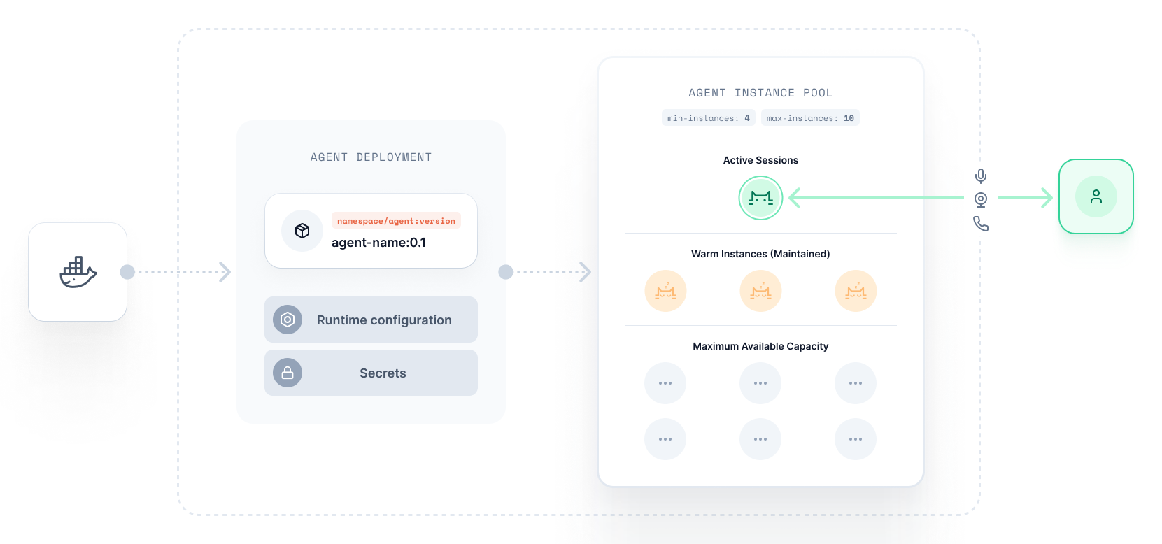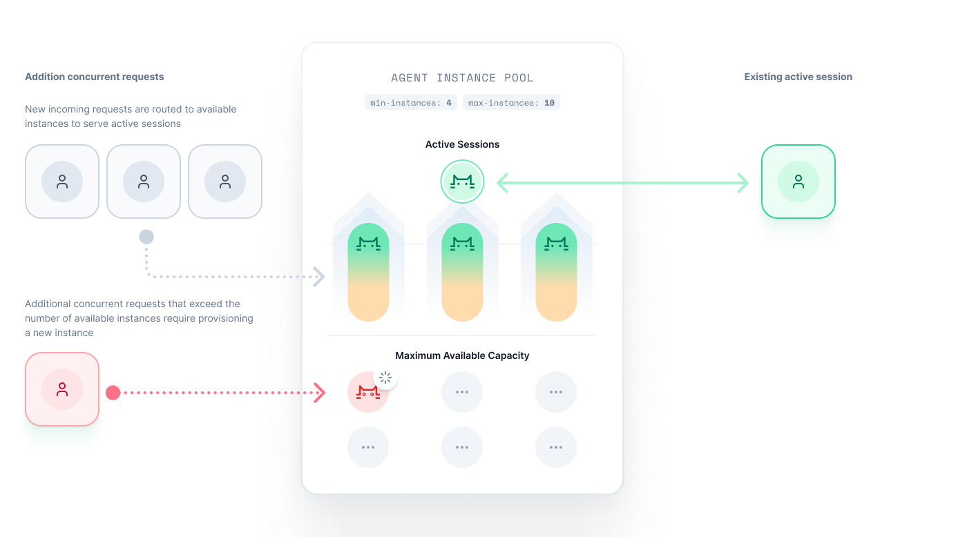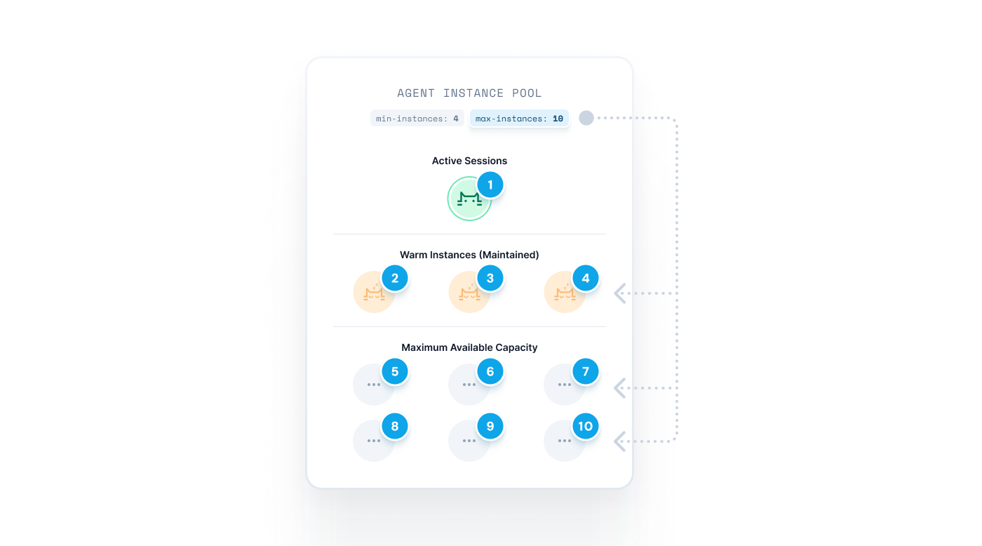 Developers specify a min-agents configuration to determines the number of agent instances that should be kept warm in their deployment pool. A warm instance is kept running and can immediately be used to serve an active session. Maintaining a minimum number of agent instances is important to keep agent start times fast and reduce cold starts.
